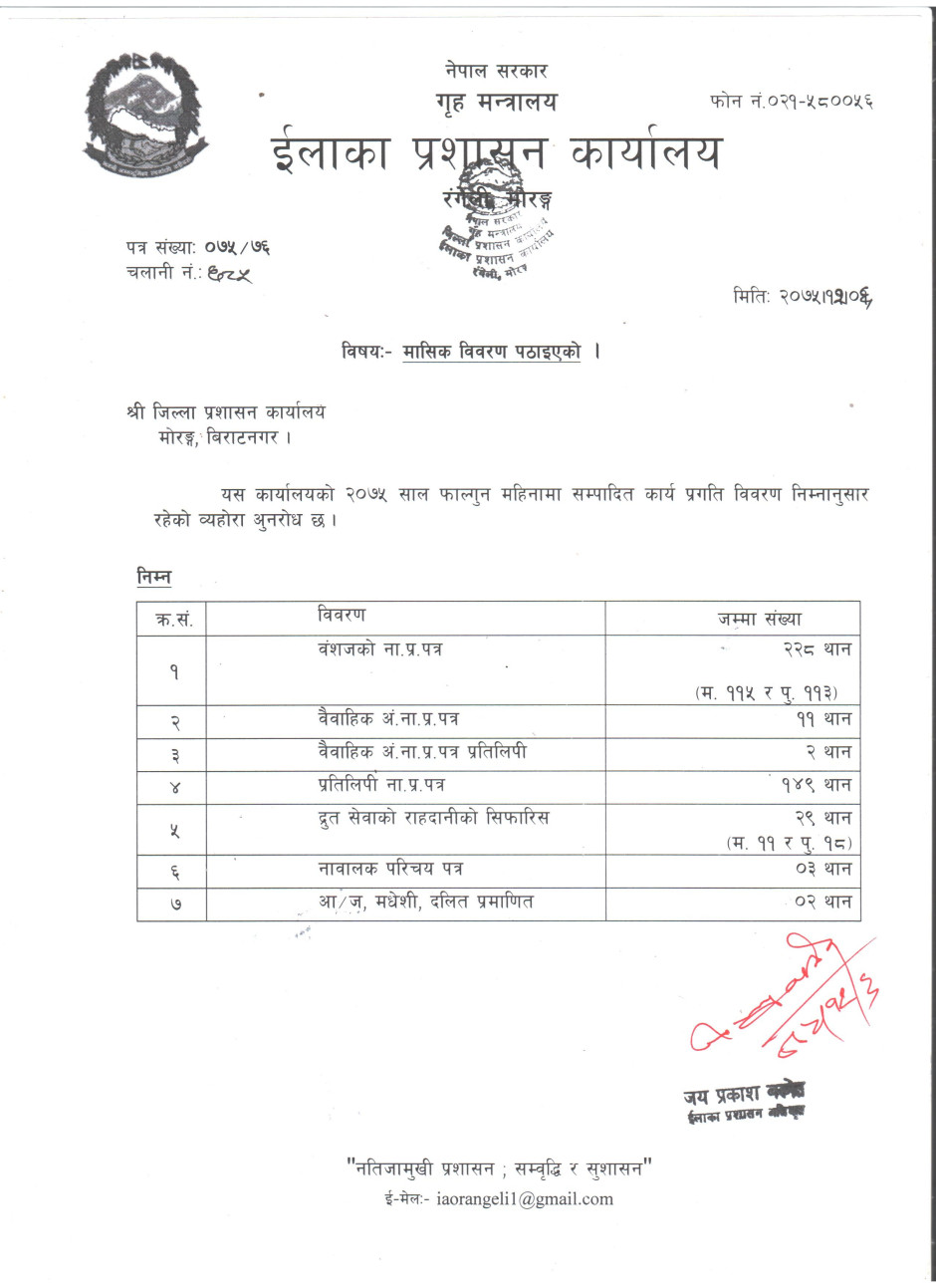 ईलाका प्रशासन कार्यालय रंगेलीको आ.व ०७८।०७९ को चौथो त्रैमासिक प्रगति विवरण